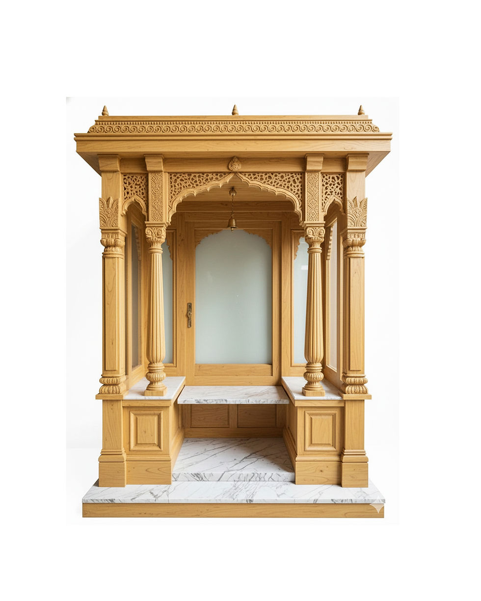 Handcrafted wooden mini pooja room with elegant design, offering a peaceful and sacred space within limited interiors.