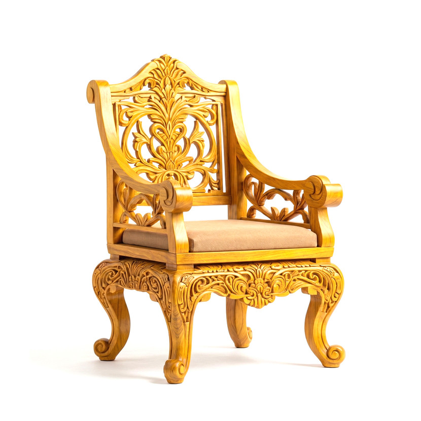 Crafted entirely from premium-grade wood, naturally seasoned for durability and stability, the chair showcases deep relief carvings, a solid plank seat, and elegantly curved legs. Every detail is shaped by skilled artisans, ensuring a refined finish and long-lasting quality.