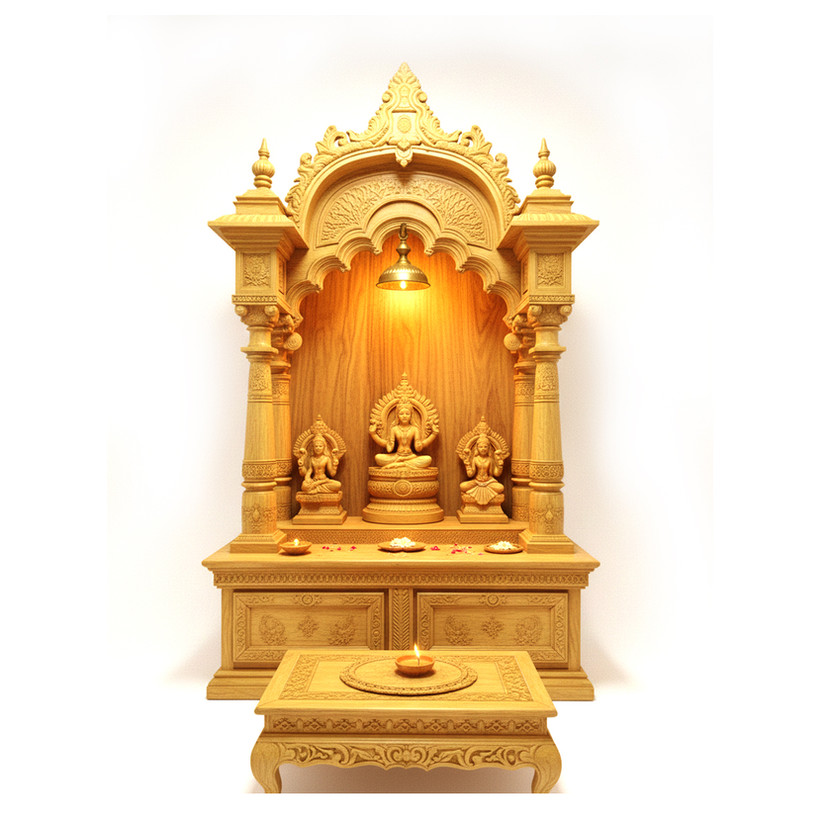 Crafted from premium-grade, naturally seasoned solid wood, the mini pooja room highlights the natural grain and warm tone of the timber, creating a serene and auspicious presence within the home.