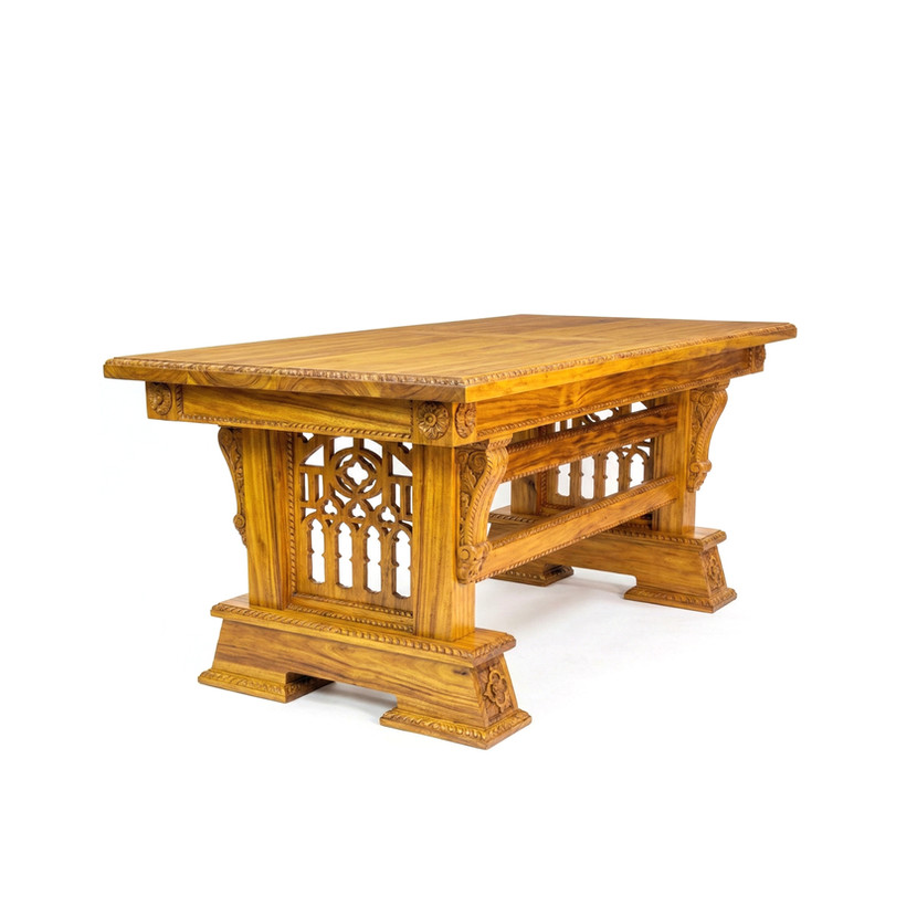 The Handcrafted Solid Wood Rectangular Dining Table by Tarumaya is a refined expression of balance, craftsmanship, and functional elegance. Defined by its clean rectangular form and graceful hand-carved arches, this table blends traditional detailing with a timeless silhouette—making it equally suited for sophisticated living spaces and elegant dining areas.